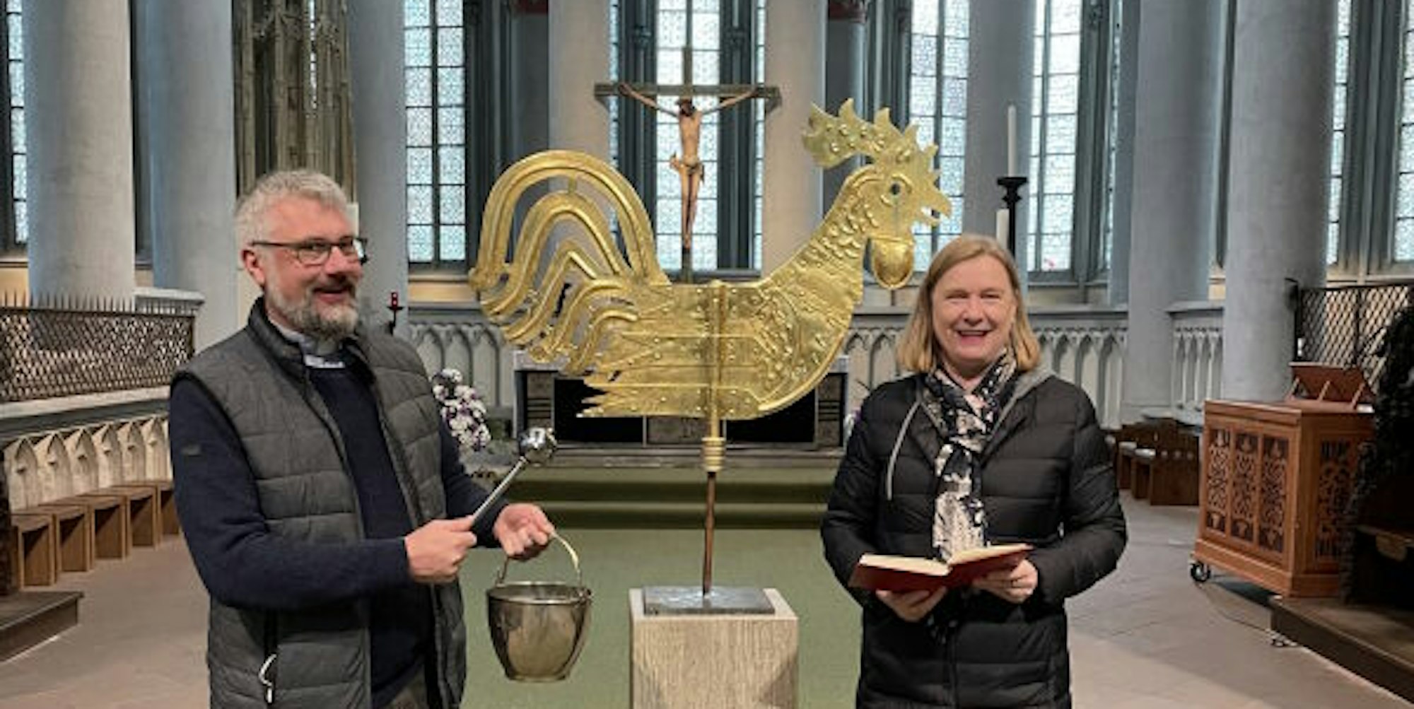 Pfarrerin Claudia Posche und Pfarrer Thomas Taxacher segneten den Wetterhahn ein, bevor er in die Lüfte ging.