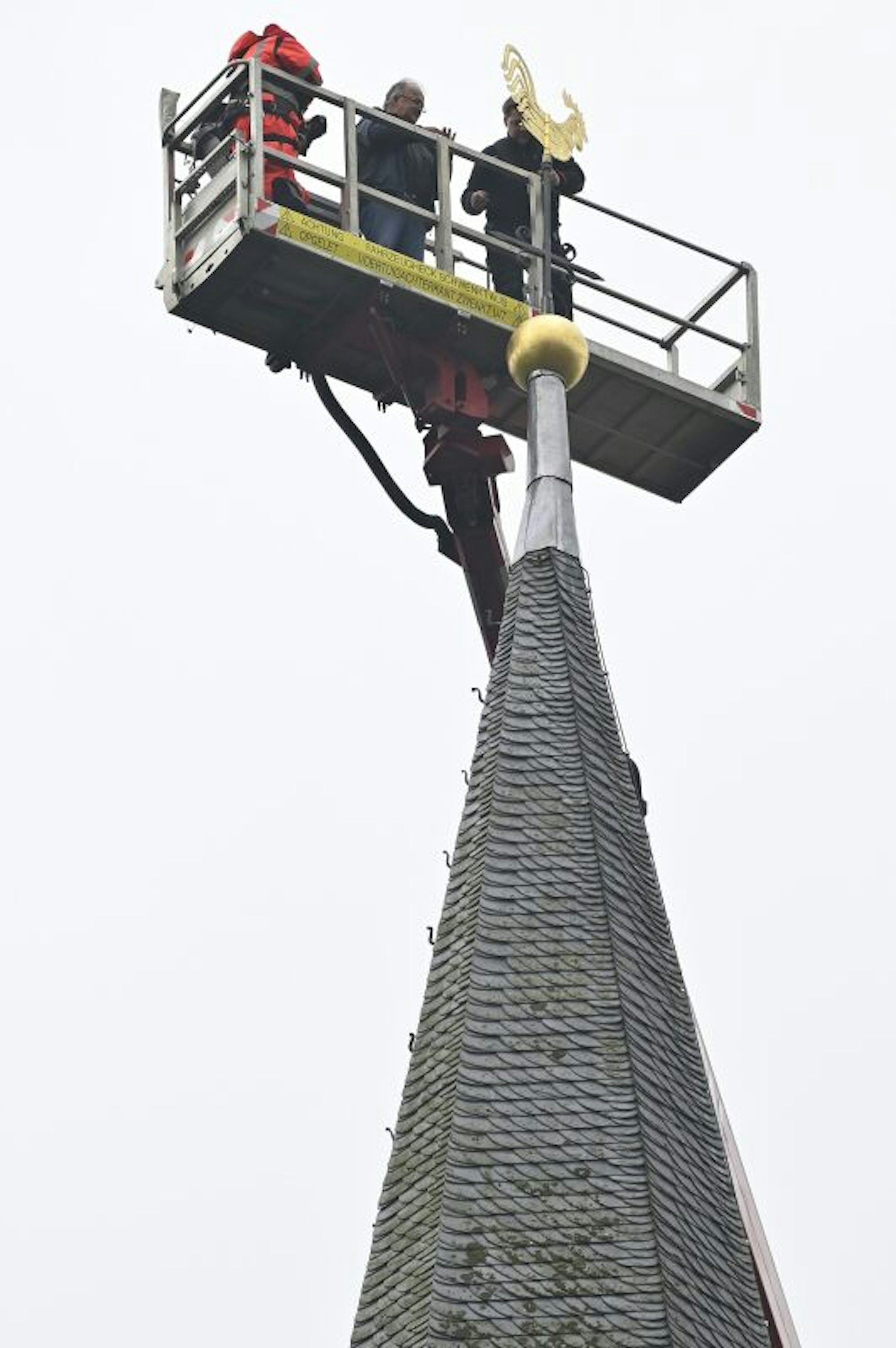 Eine mobile Arbeitsbühne mit einem 90 Meter langen Auslegerarm sorgte dafür, dass der Hahn im Korb in die Lüfte ging. Am Turm montierten die Handwerker zunächst das Kreuz mit der Kugel und schließlich den zuvor von Pfarrerin Posche und Pfarrer Thomas Taxacher eingesegneten Wetterhahn. „Die Montage in dieser luftigen Höhe ist eine Herausforderung für Handwerker“, erklärte Manfred Fischer, der die Restaurierung koordinierte. Aber der Weg des Wetterhahns zurück an die Spitze glückte. Catrin Riquier: „Jetzt glänzt er wieder dort, wo er hingehört.“