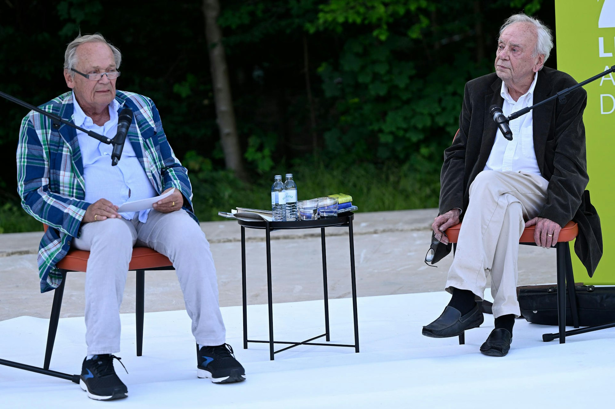 „Es hat mich überrannt, und es bewegt mich sehr, dass Altenberg in der Gemeinde Odenthal ein Ort der Literatur wird“, sagt Jürgen Becker im Gespräch mit Joachim Sartorius über das Festival. So liegt es nahe, dass er sich bei der Lesung aus seinen Büchern auf Odenthal konzentriert. Es sei neben seinem Kölner Domizil seit 1963 „der Ort meines Schreibens“ sagt Becker, der am 10. Juli seinen 90. Geburtstag feiert. Im Freien vor der Kulisse des Altenberger Doms, an einem hochsommerlichen Abend, wirken Beckers Zeilen aus dem Gedichtband „Odenthals Küste“ noch eindringlicher. Auch den von seiner verstorbenen Frau Rango Bohne gepflegten Garten lässt Becker über seine Romanfigur Lena für das Publikum plastisch werden.