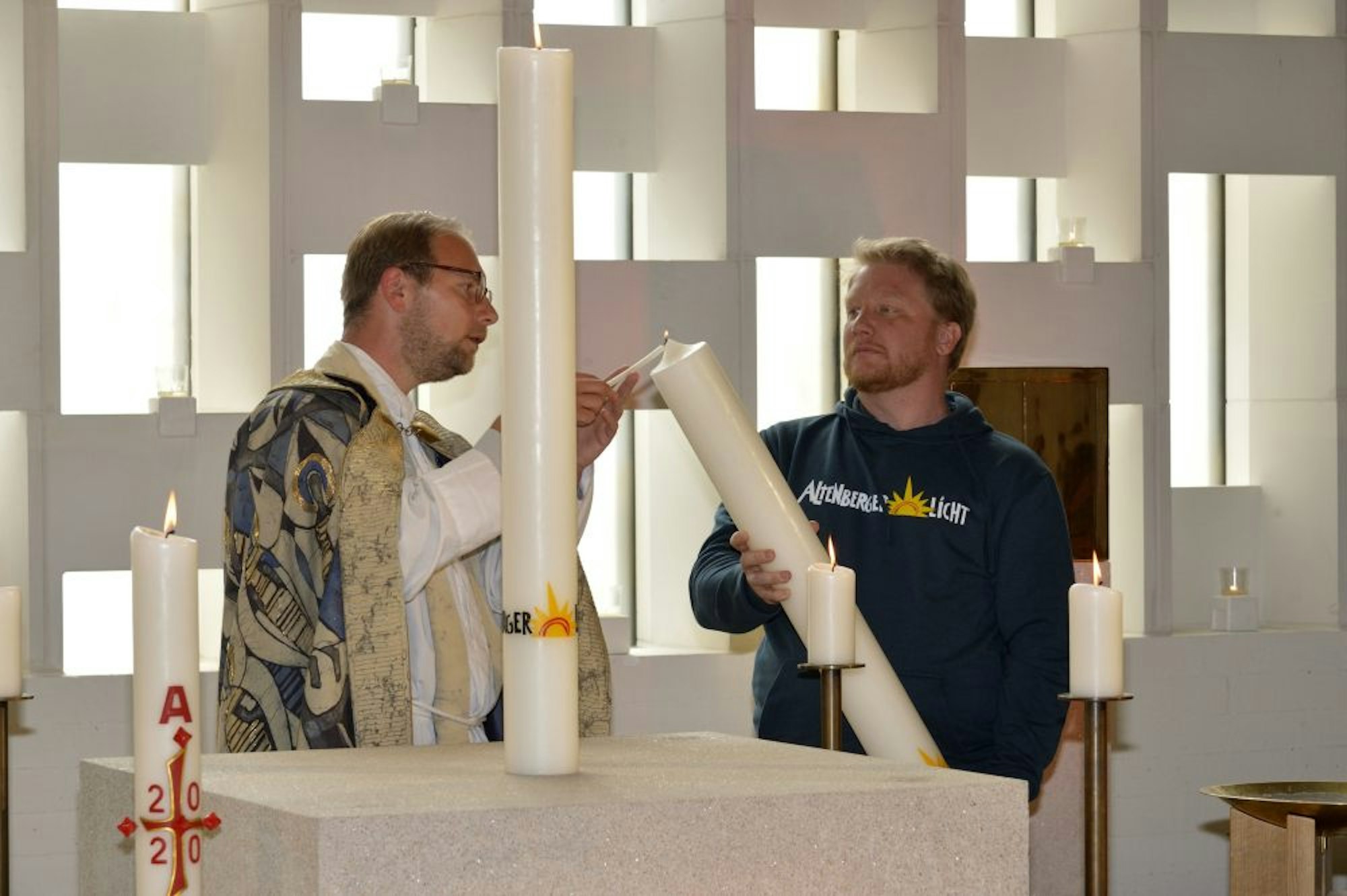 Iman Blume und Marvin Dederichs wurden aus dem Kölner Dom zugeschaltet, wo das Altenberger Licht bereits brannte, das in diesem Jahr „einzigartig und doch irgendwie schön ist“. Zehn große Kerzen haben das Zeichen der Hoffnung bis nach Essen und Euskirchen, Düsseldorf und Morsbach gebracht. Eine steht auch im Altenberger Dom. Wer möchte, kann sich dort in den nächsten zehn Tagen das Licht abholen.