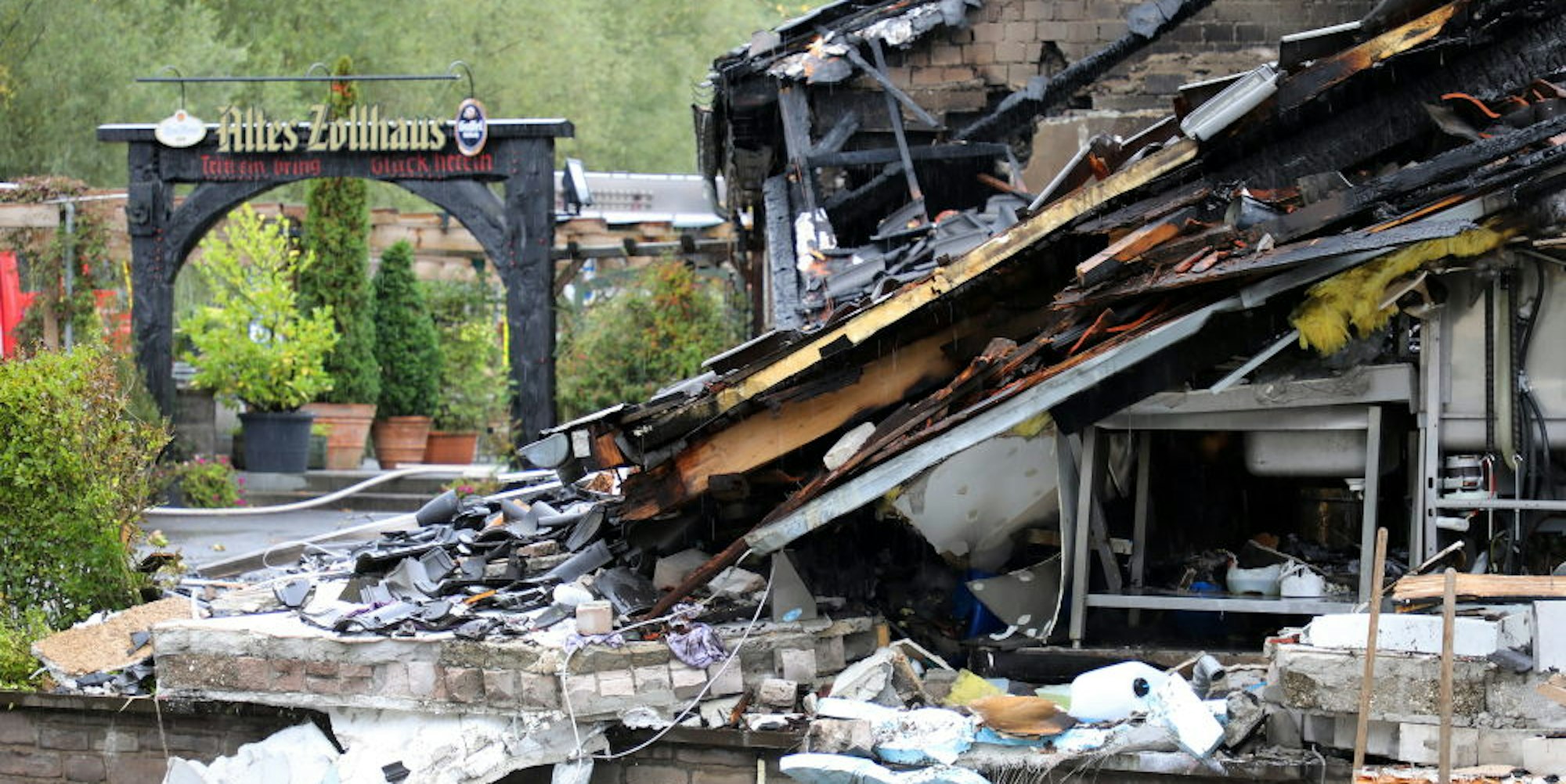 Kaum mehr als das Tor zum Biergarten blieb unversehrt. Die Küche des Alten Zollhauses (r.) stürzte beim Brand komplett ein.