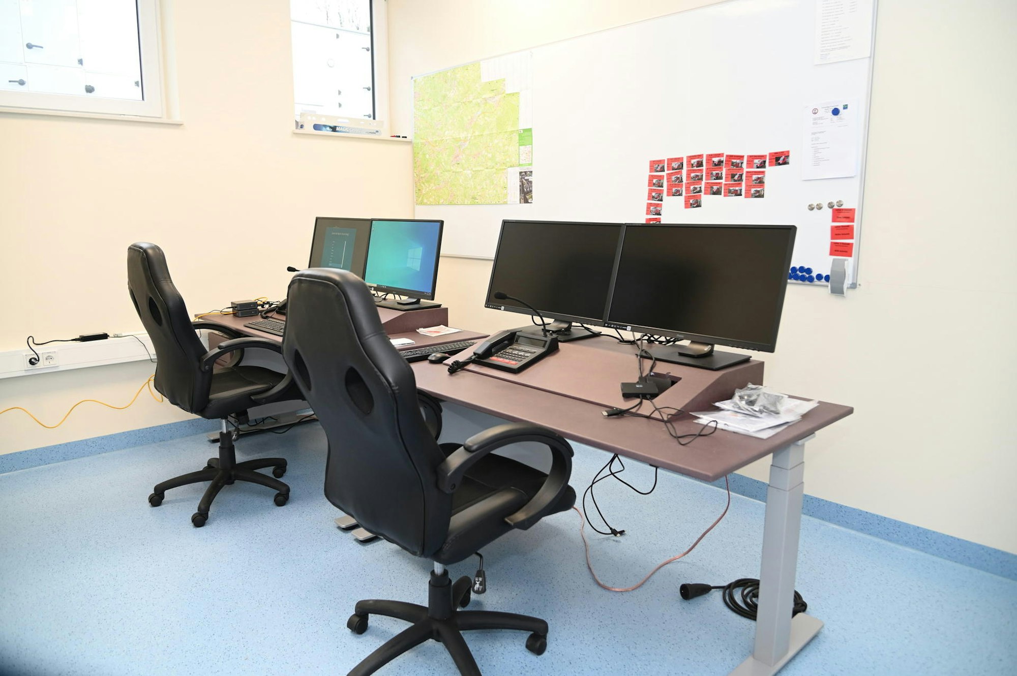 Auch er ist mit moderner Technik ausgestattet, im Boden liegen die Anschlüsse für Strom, Telefon und Internet. Nebenan ein kleinerer Raum für den sogenannten „Meldekopf“, der bei größeren Einsätzen wie Wasser- oder Sturmschäden besetzt ist und die Einsätze koordiniert. Zwei Arbeitsplätze jeweils mit Doppelbildschirm und Telefonanlage stehen bereit für die Notfälle. „Wir durften viel mitbestimmen, auch während der Bauphase“, lobt Dirk Schmitz die Zusammenarbeit mit der Stadtentwicklungsgesellschaft Overath (Sego) als Bauherr.