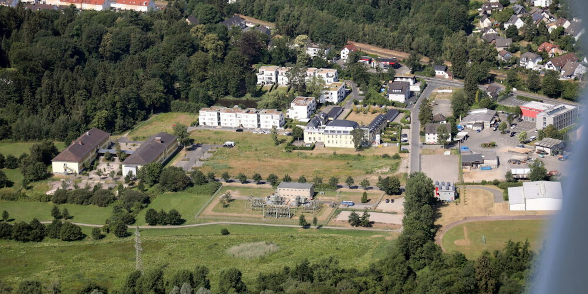 Das Hauptgebäude (links) der Albert-Einstein-Schule muss saniert, die Sporthalle (rechts) gegebenenfalls abgerissen werden. Angrenzend: Château Venauen (Mitte).