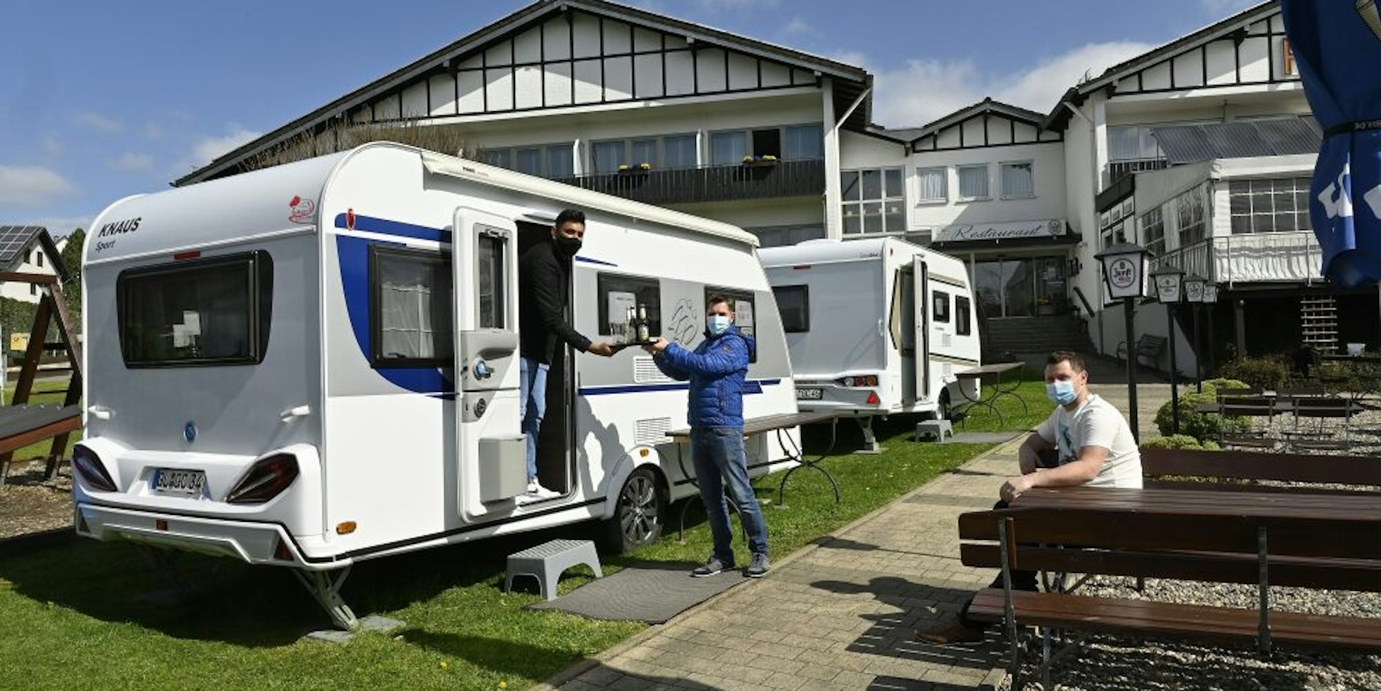 Mitte Januar hat die Firma Travel-Camper mit dem Wohnwagen-Vermieten in Restaurantnähe begonnen, seither ist die Nachfrage rasant gewachsen. Allein am Lehmbacher Hof in Rösrath verzeichnet Vermieter Michell Marks inzwischen 1100 Buchungen. Kunden mieten die Wohnwagen für zwei Stunden, gleichzeitig wird das Restaurant über die Vermietung und die zu erwartenden Gäste informiert. Damit ist für reibungslosen Service gesorgt: Die Gäste bestellen ihr Menü telefonisch vom Wohnwagen aus und bekommen ihre Speisen auf abgedeckten Porzellantellern an die Wohnwagentür geliefert.