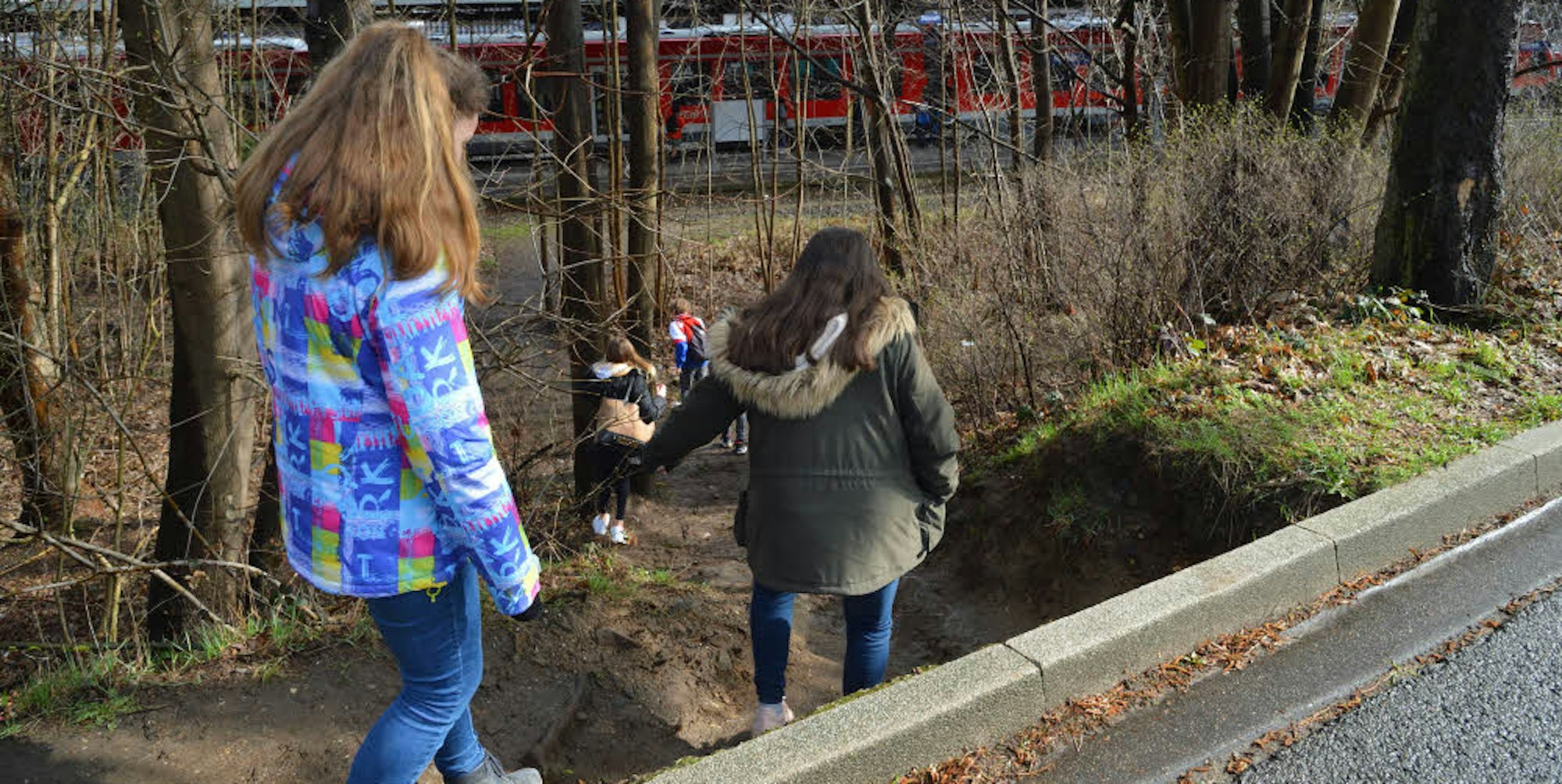 Die ungesicherte Abkürzung über die Landstraße und weiter über den Hang am Bahnhof Rösrath ist bei Schülern populär.
