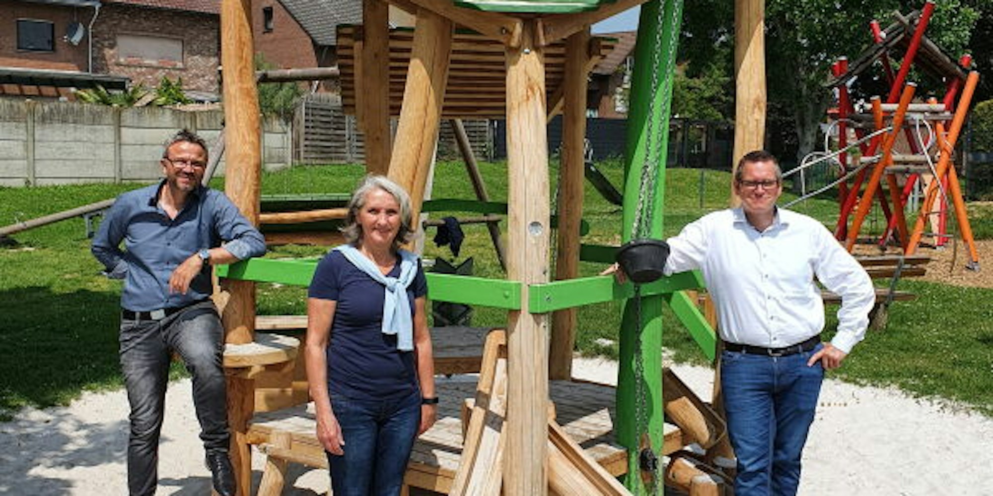 Bürgermeister , Fachdienstleiter Klaus Brunken und die Kirdorfer Ortsbürgermeisterin Angelika Dreikhausen machten sich nun selbst ein Bild vor Ort. Dreikhausen hatte sich mit einem Antrag für die neue Spiellandschaft eingesetzt. In Abstimmung mit der Jugendhilfeplanung, dem Schulverwaltungsamt sowie dem Bauhof wurde das Spielgerät angeschafft.