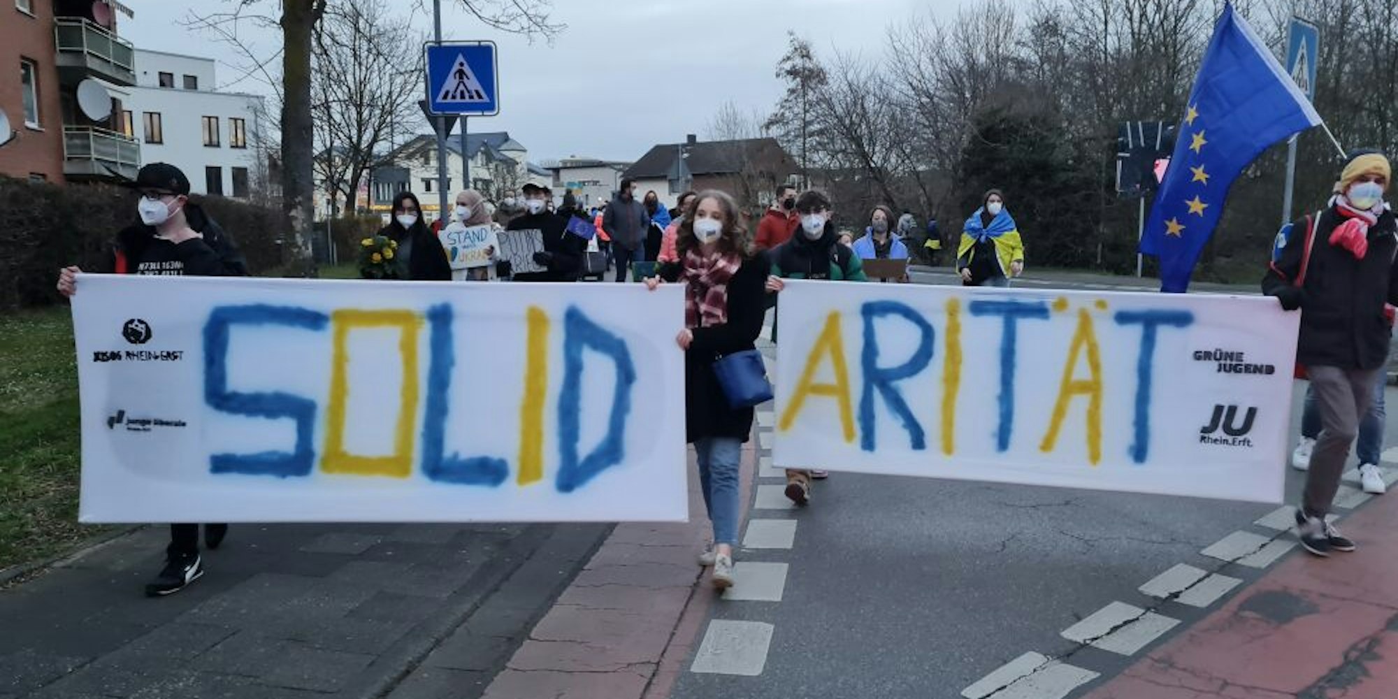 Bergheim – Zu einer Demonstration gegen den Krieg in der Ukraine hatten die Jugendorganisationen Junge Union (CDU), Jusos (SPD), Grüne Jugend (Bündnis 90/Grüne) und Junge Liberale (FDP) aufgerufen.