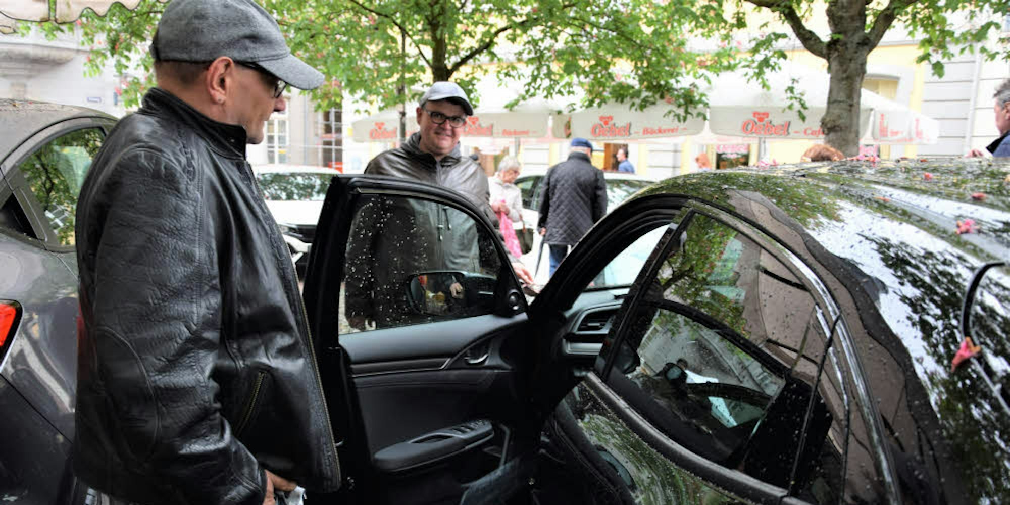 Thomas (r.) und Stefan (l.) Stöckl nutzen die Gelegenheit, sich auf der Autoschau „Mobiles Brühl“ umzusehen.
