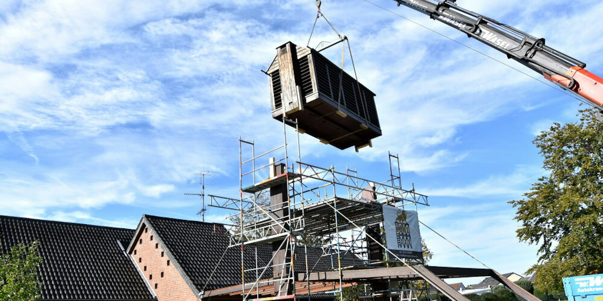 Langsam hob der von Udo Clemens gesteuerte Mobilkran des Quadrather Unternehmens Wolfgang Wasel den Kasten an. Zuvor hatte das Team um den Elsdorfer Zimmermann Berthold Krause das hölzerne Glockenhaus in doppelte Schaukelschlaufen aus armdicken Seilen gehängt und danach die Verbindung des Kastens mit den Tragpfeilern gekappt. Ruhig schwebte das rund drei Tonnen schwere Teil durch die Luft auf die Kirchwiese, wo es zunächst stehen bleiben soll.