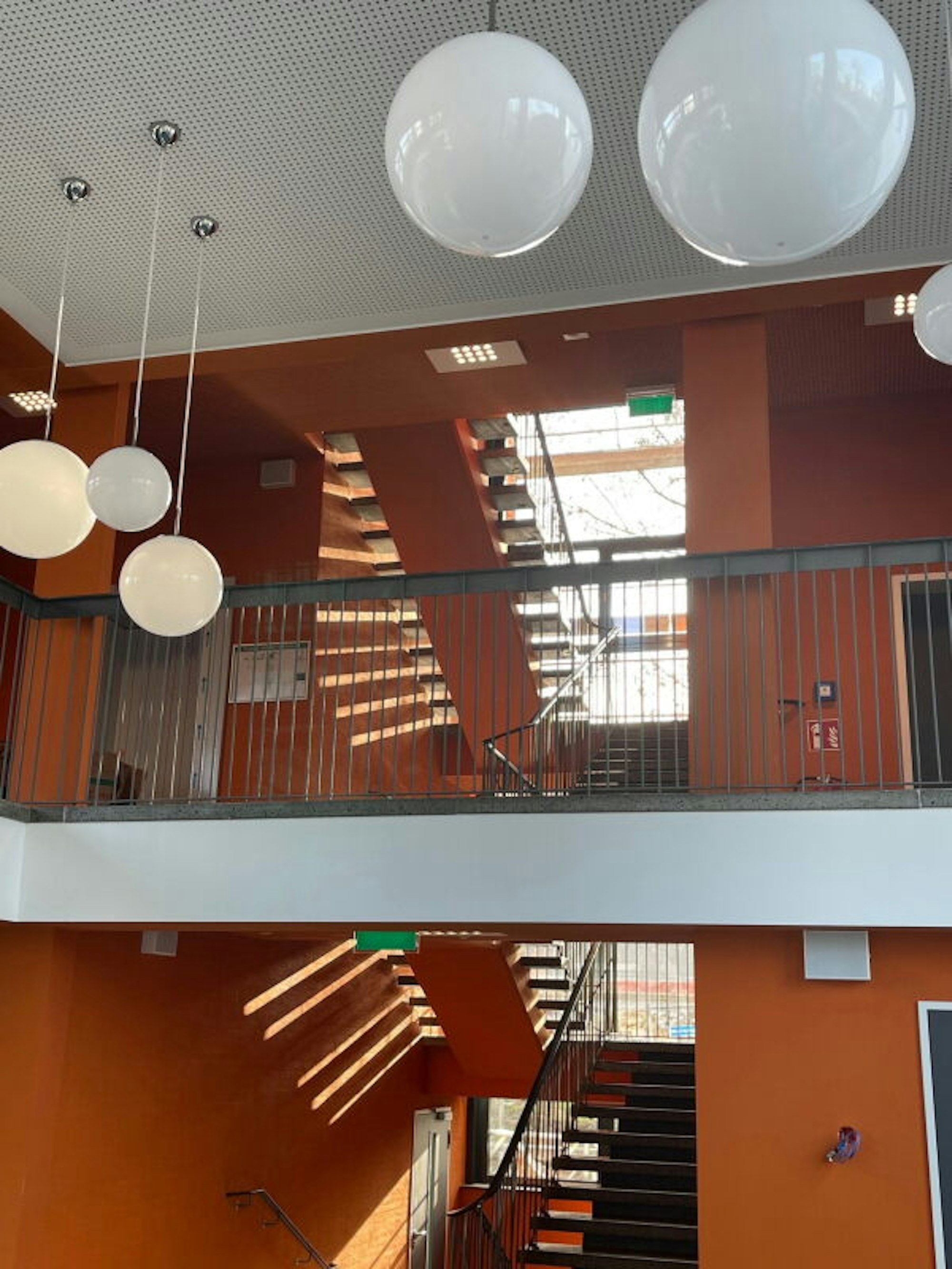 Das Treppenhaus öffnet sich zum großzügig bemessenen Foyer, in dem es auch Sitzmöbel gibt.