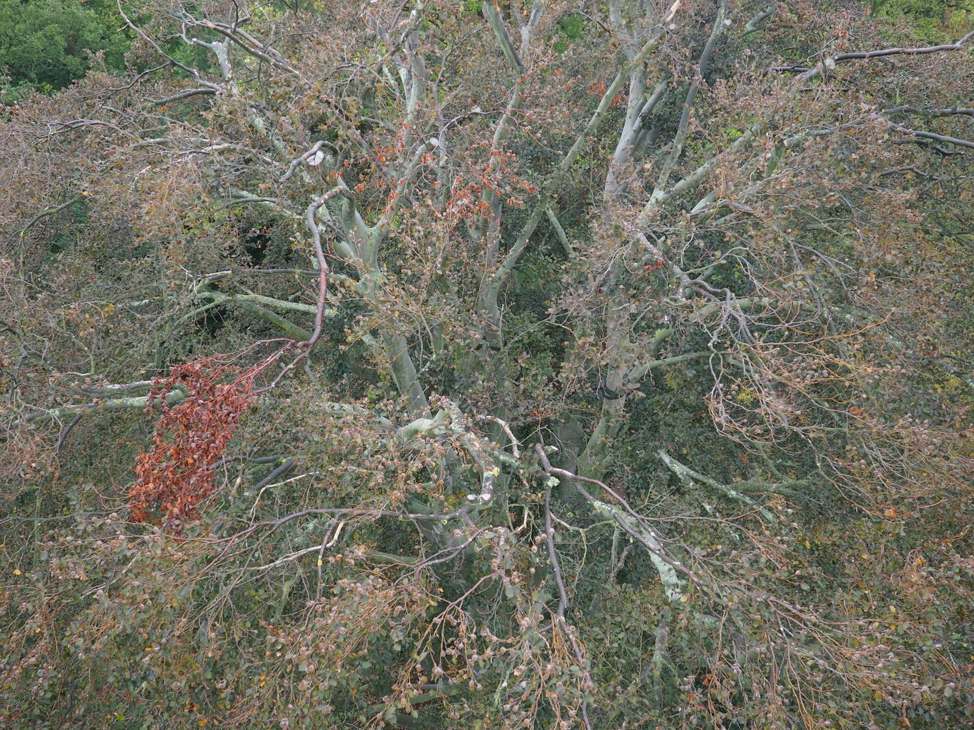 Der Blick von oben in die Krone macht klar, dass die Buche krank war und nur noch schütteres Laub trug.