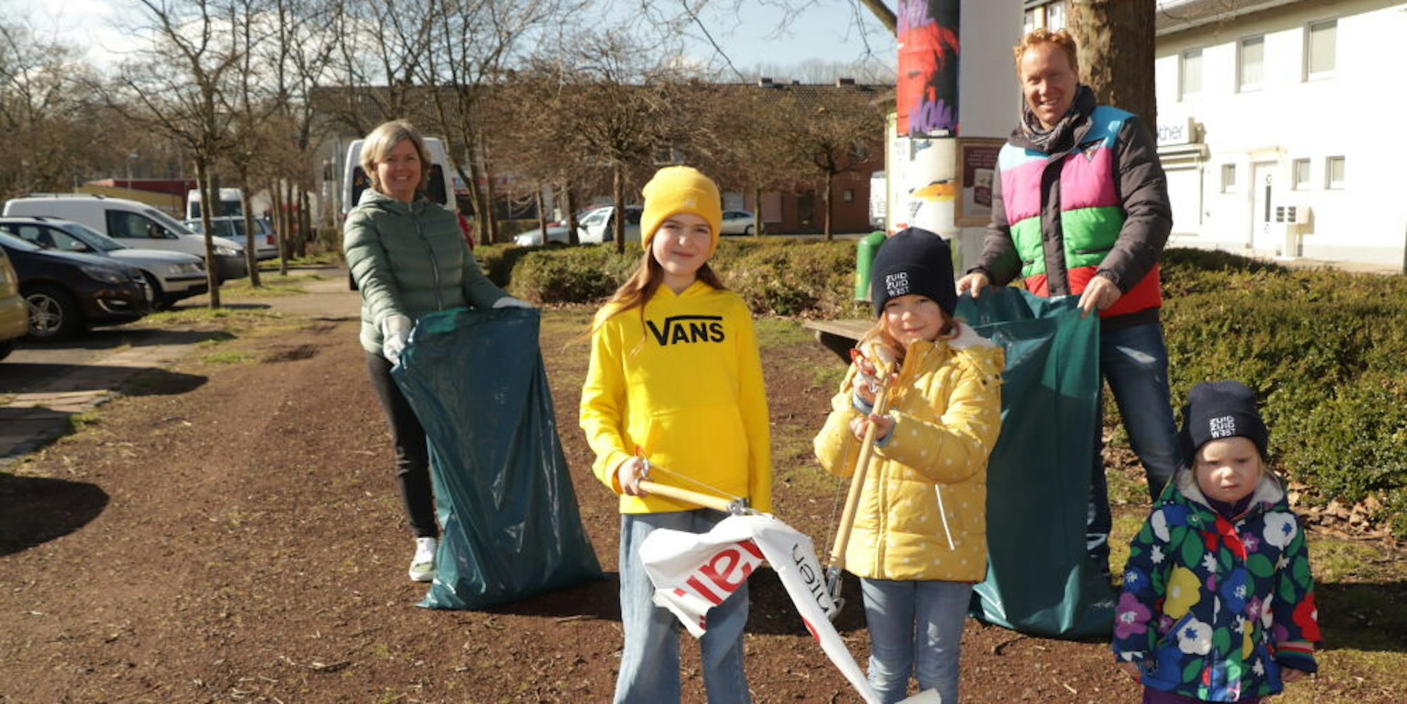 Anja Behrent und Dominik Glowienka beteiligten sich mit ihren drei Töchtern Hilde, Lotte und Pia (v. l.) an einer Müllsammelaktion in Hürth. (Archivbild)