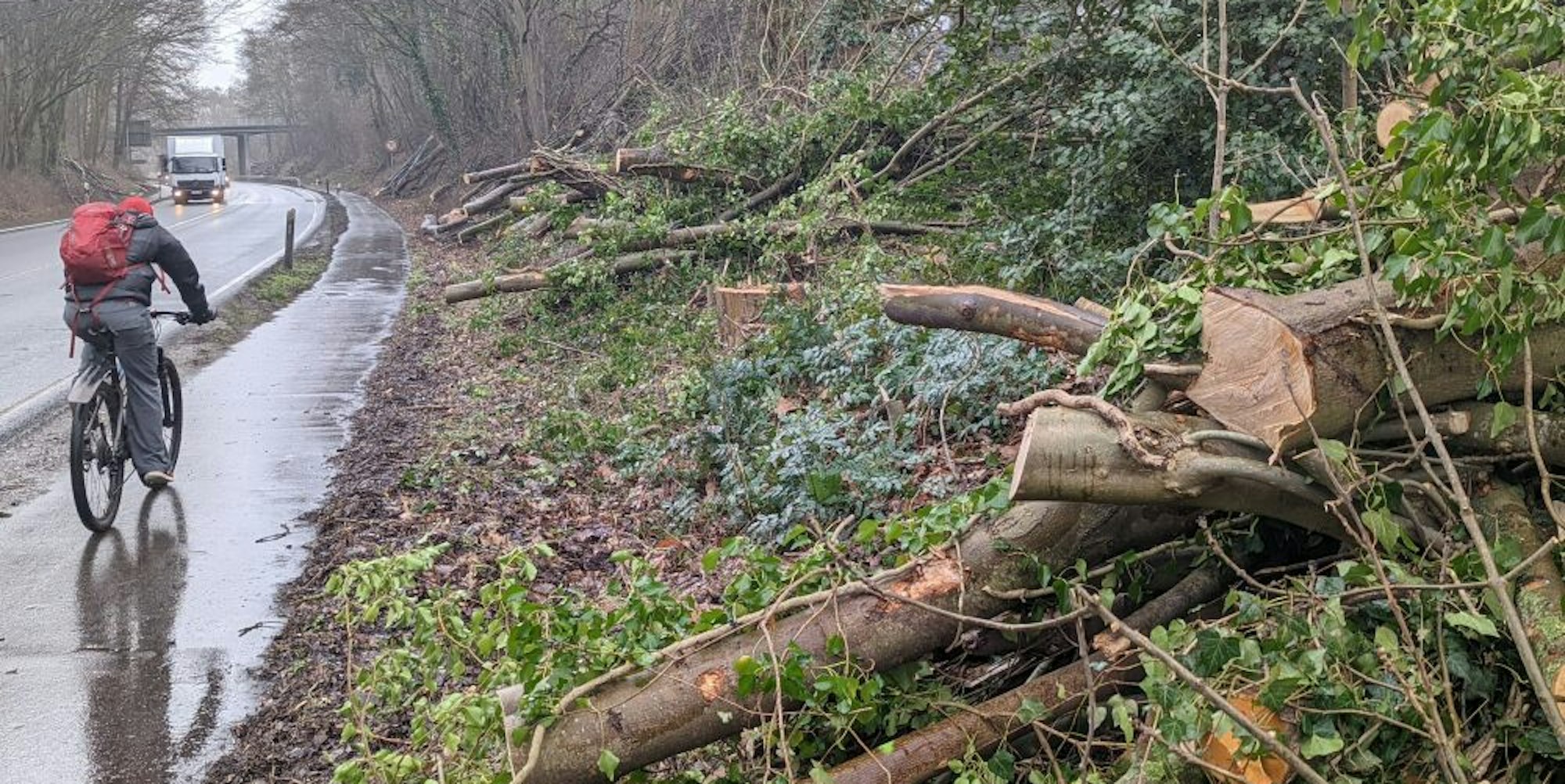 Gefällte Bäume liegen neben dem schmalen Radweg an der Luxemburger Straße.