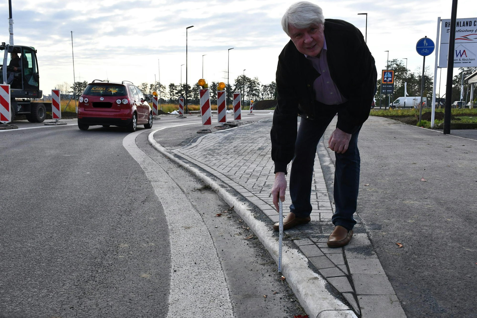 Im Zusammenhang mit dem Neubau hat Aldi auch die Bonnstraße umbauen lassen. Die Stadt hat mit dem Handelsunternehmen einen Erschließungsvertrag abgeschlossen, der neben einem Kreisverkehr zur Anbindung der Parkplätze auch den Bau der Bushaltestelle vorsieht. Die Straße wurde leicht verschwenkt, so dass der Verkehr um den aufgepflasterten Haltestellenbereich herumfahren muss. Ein neuer Bordstein trennt Pflaster und Fahrbahn – für Klie der Stein des Anstoßes.