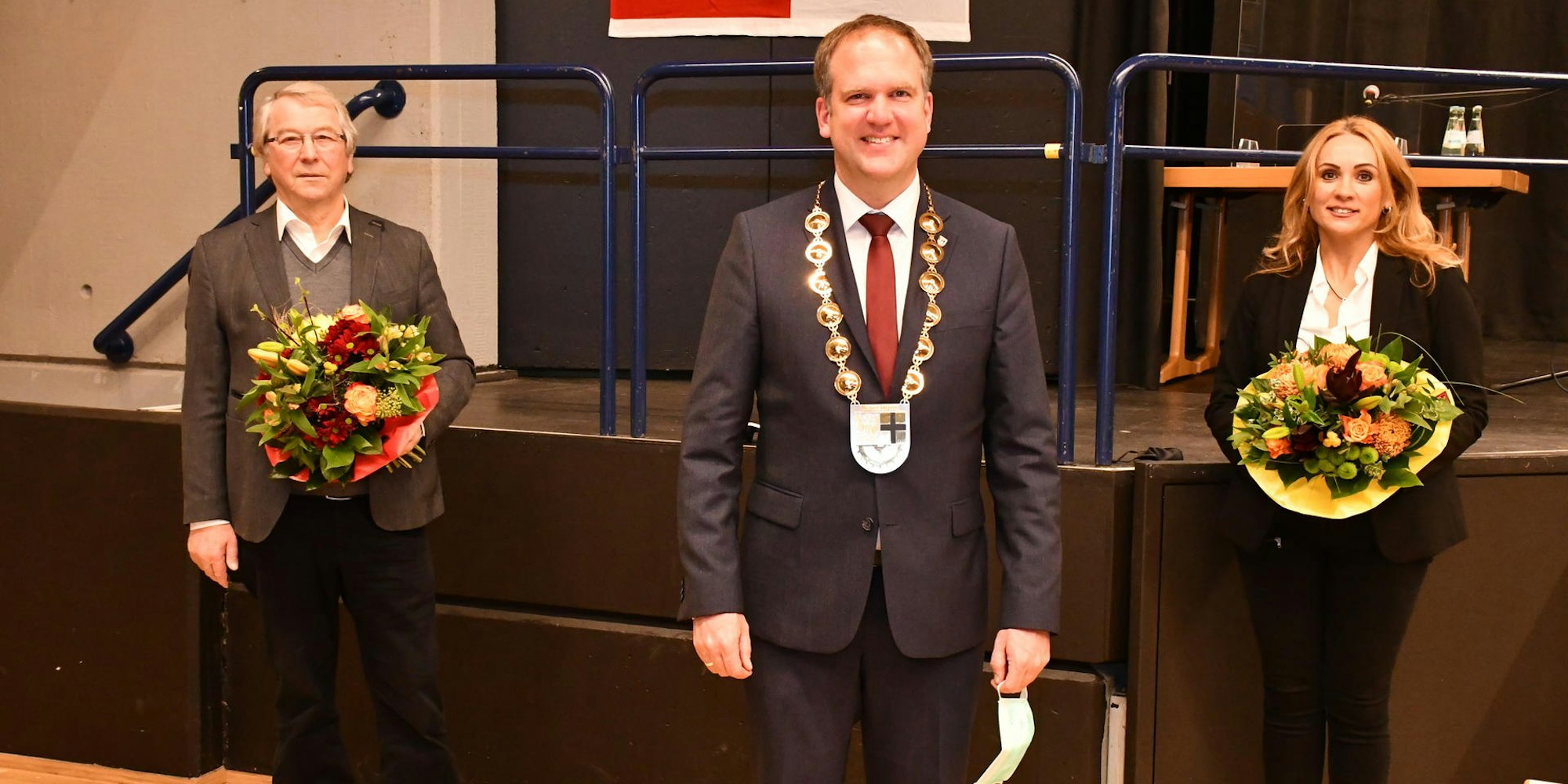 Auf Distanz gratulierte Bürgermeister Dirk Breuer (M.) seinen gewählten Stellvertretern Peter Prinz und Aylin Kocabeygirli.
