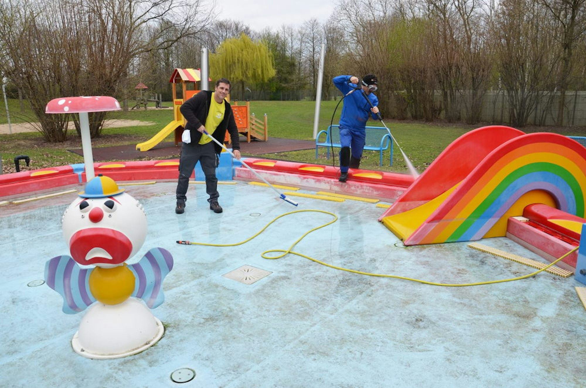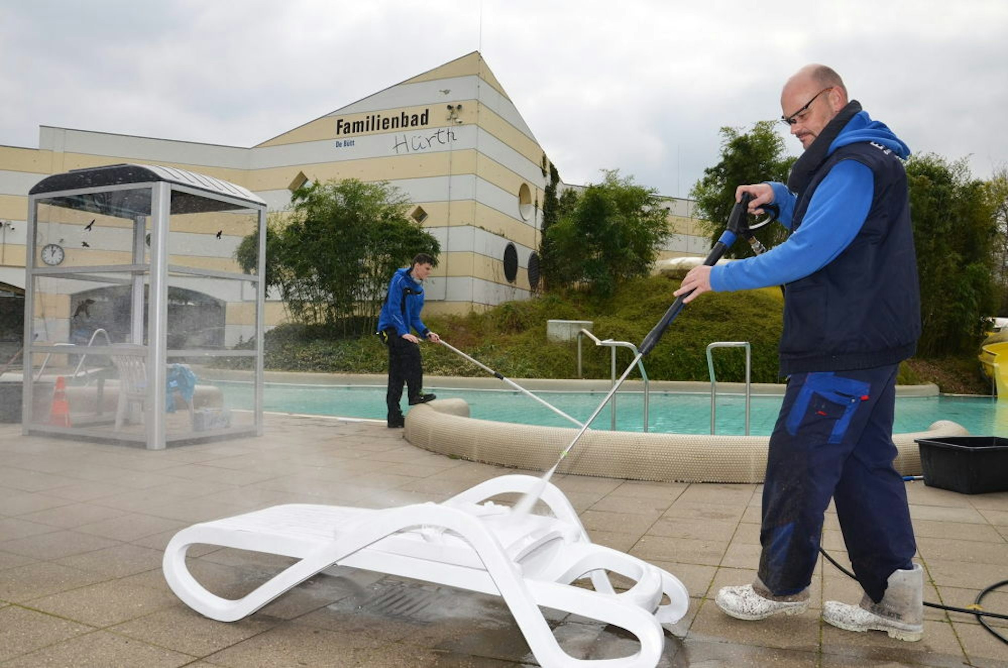 Das Außengelände wird auf den Start der Sommersaison vorbereitet. Becken, Spielgeräte und Mobiliar werden gereinigt. Das Außenbecken bekommt neue Unterwasserscheinwerfer.