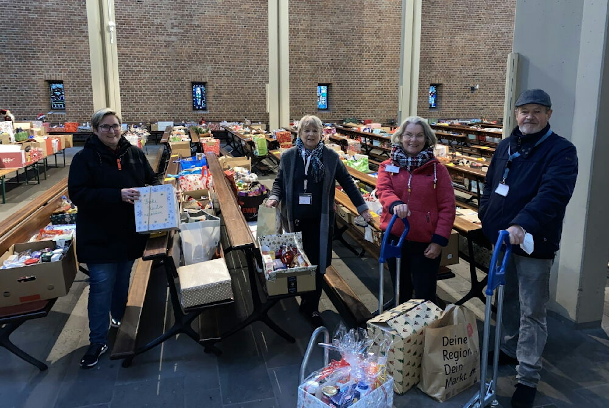 Am Nachmittag wurden sogar weitere Bänke in die Kirche gestellt, da die vorhandenen als Ablage nicht mehr ausreichten. „Ich freue mich jedes Jahr, wenn ich die Kirche voller Pakete und die glücklichen Kunden sehe. Es ist immer wieder überwältigend“, sagte Iris Dulcius, die seit 14 Jahren bei der Weihnachtskisten-Aktion dabei ist. Gemeinsam mit weiteren Mitarbeiterinnen und Mitarbeitern der Tafel wirft sie vorher einen Blick in die Kisten, um zum Beispiel Kinderspielzeuge oder auch Tierfutter auszusortieren und an einem gesonderten Stand zu verteilen. So bekommen es auch die Menschen, die es brauchen. Inhalte aus den Kisten, die nach der Ausgabe noch übrig bleiben, werden im „Tafel-Laden“ in Kerpen untergebracht und dann dort ausgegeben.
