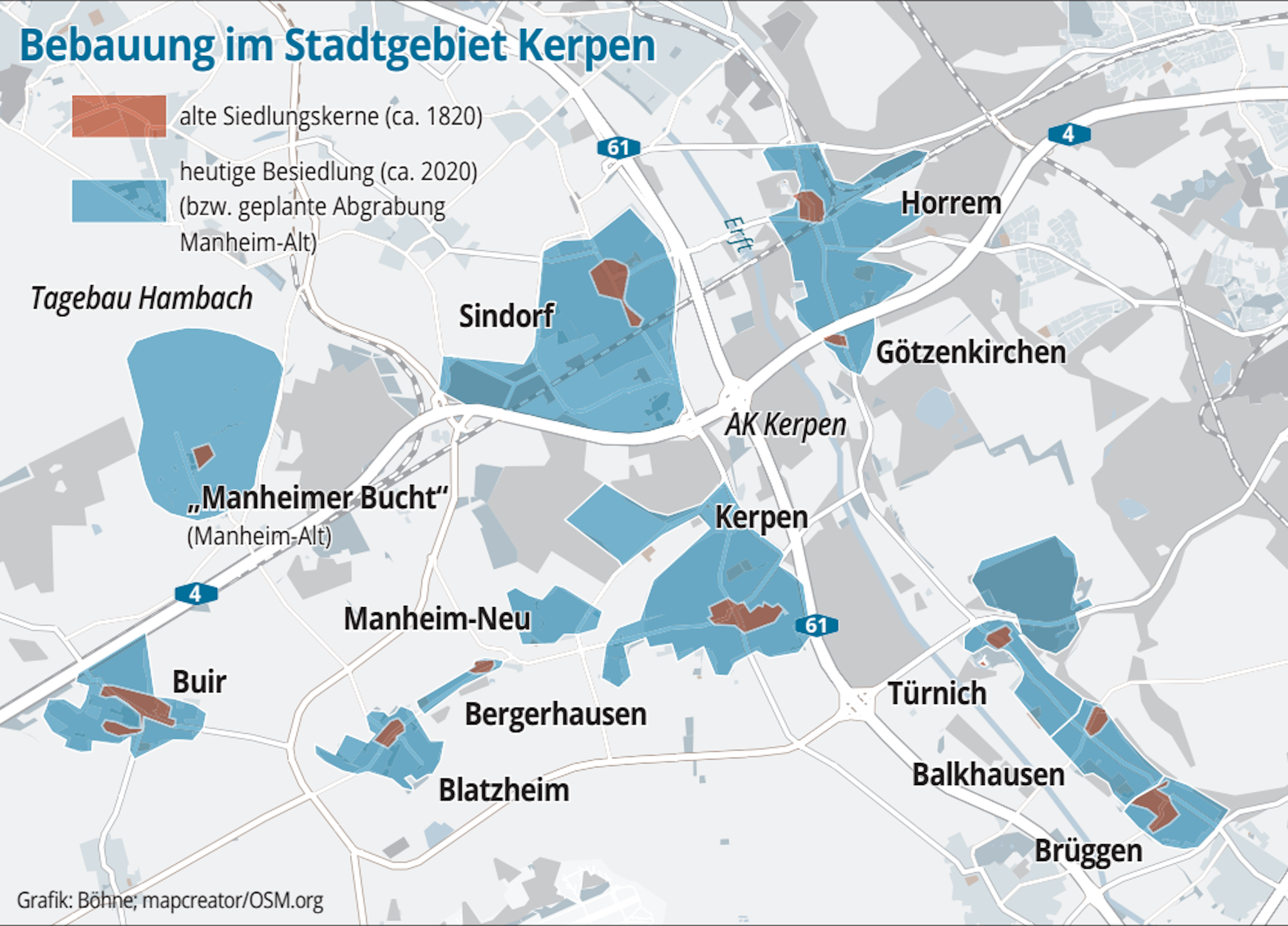 So wies das heutige Stadtgebiet im Jahre 1821 nur einige kleine Siedlungsschwerpunkte rund um Kirchen oder Burgen und Schlösser auf. Seitdem sei die besiedelte Fläche in Kerpen aber um das 44-fache gestiegen.