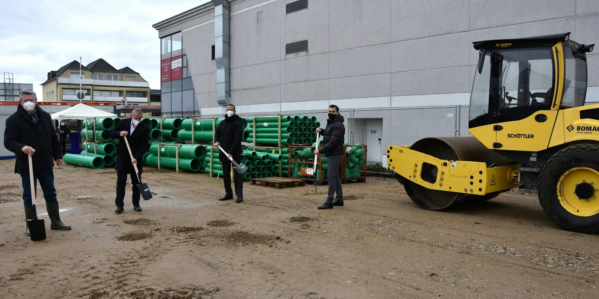 Nach den Grußworten griffen Investor Bert Hoffmann, Starkl, Spürck und Bröcker zum Spaten. Trotz unerwarteter Festigkeit des gewalzten Kiesuntergrunds gelang es ihnen, ihre Spaten einigermaßen für den symbolischen Akt zu füllen. (ftz)