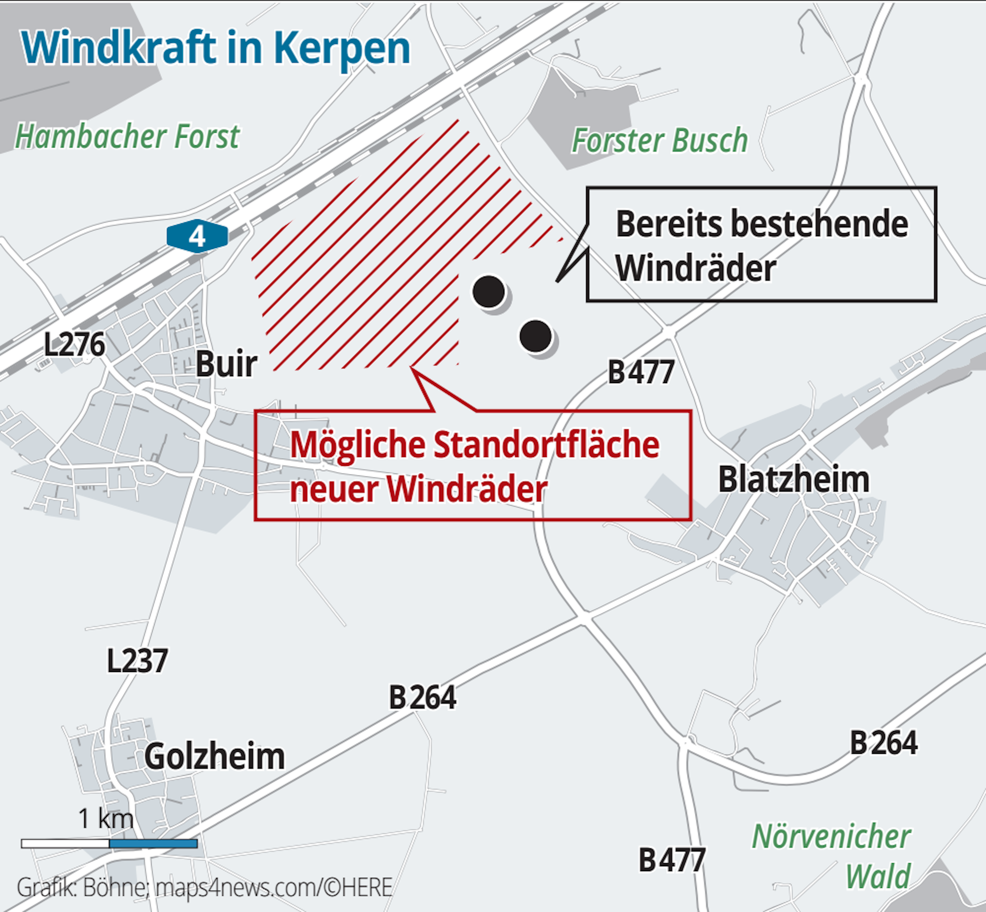Sollten es allerdings drei Windräder werden, kollidiert das Ganze mit geplanten Neubauvierteln bei Buir. Dann würde eines der Windräder näher als 1500 Meter an das neue Wohngebiet heranrücken.