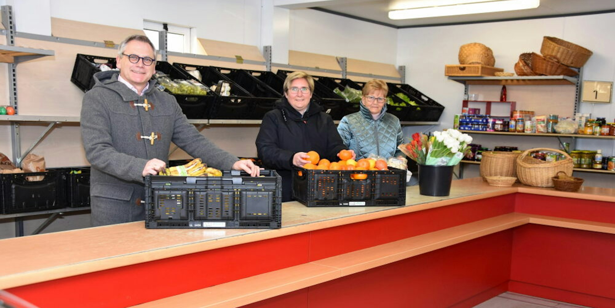 Helfer für das Team der Tafel suchen (v.r.) Gisela Hilger und Kerstin Höfer, unterstützt von Hans-Arnold Maus vom Sozialamt.