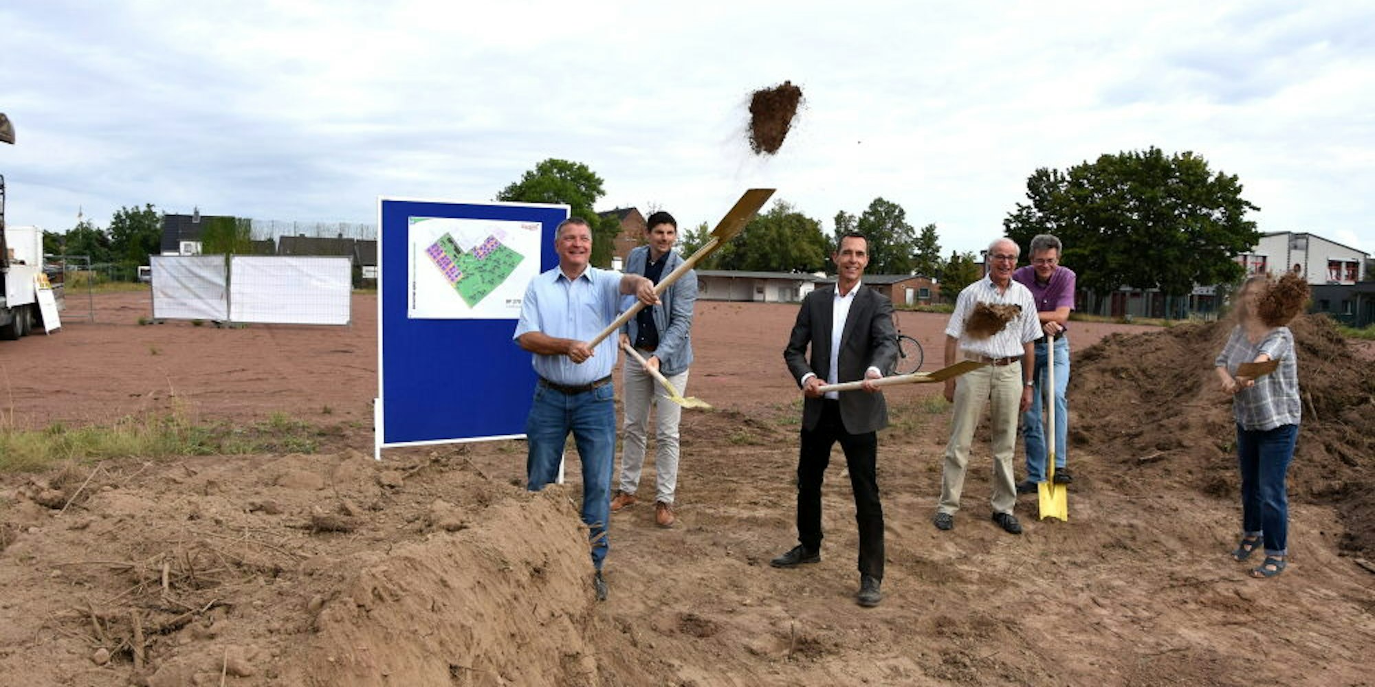 Auf dem ehemaligen Fußballplatz sollen 33 Häuser gebaut werden. Zum Spaten griffen (v.l.) Albert Weingarten, Michael Höhn, Dieter Spürck, Bernhard Ripp, Klaus Ripp und Cornelia Ellerhold.
