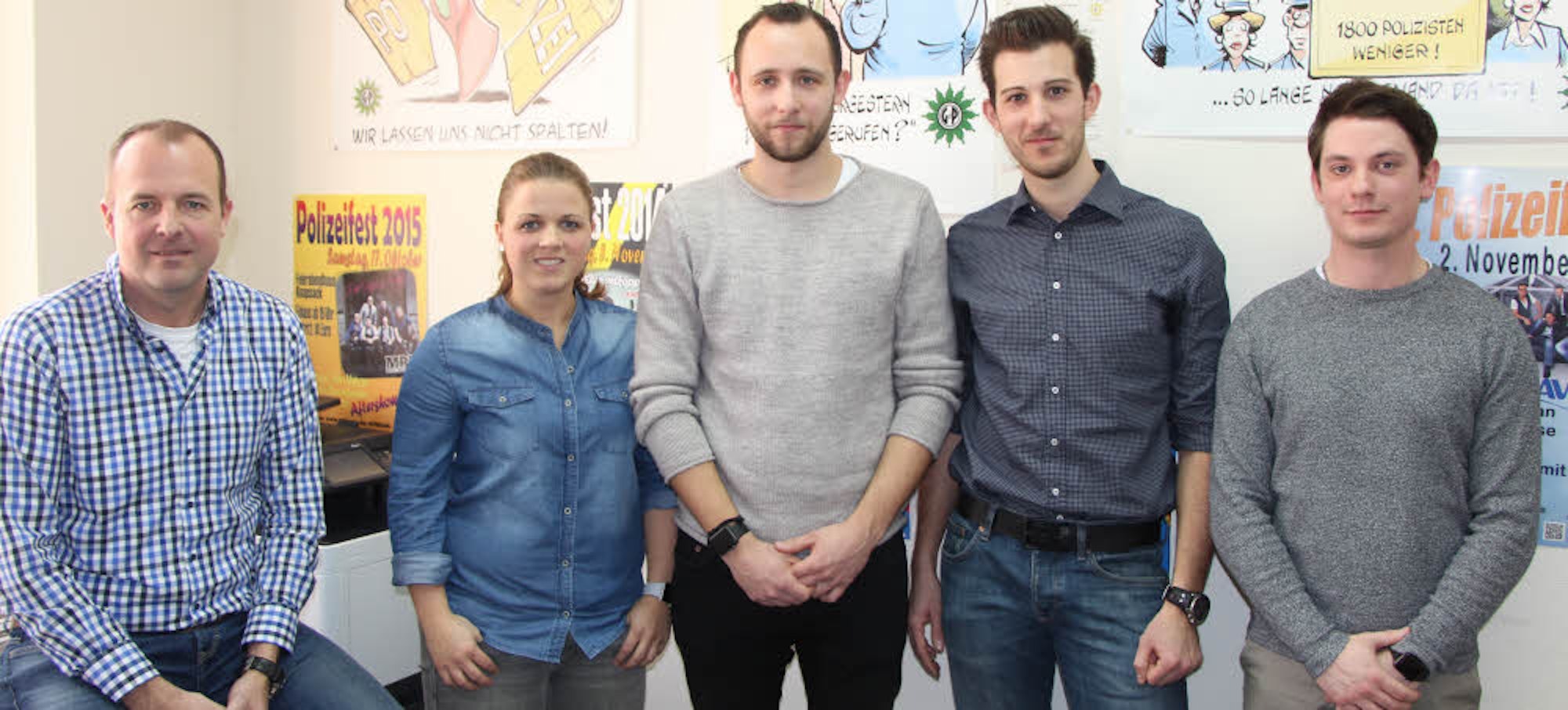Mitglieder des Vorstands der jungen Gruppe der Gewerkschaft der Polizei im Rhein-Erft-Kreis: die Polizeikommissare Tobias Greuel, Andreas Burghof, Sebastian Krychowski, Corinna Petritsch mit dem Vorsitzenden der Gewerkschaft der Polizei Thomas Stotzem. (v.r.)