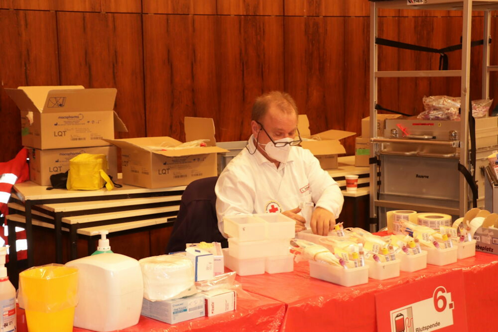 Tatsächlich entstanden bei der Blutspende im Pfarrzentrum St. Germanus keine Warteschlangen. 96 Blutspender hatten sich angemeldet. Einzeln traten die Frauen und Männer zunächst ins Foyer des Pfarrheims. Und in einem Einbahnstraßensystem ging es dann nach der Anmeldung weiter. Zunächst mussten sie einen Fragebogen ausfüllen, es folgte das Arztgespräch und erst dann ging es auf eine der Liegen zum Aderlass.