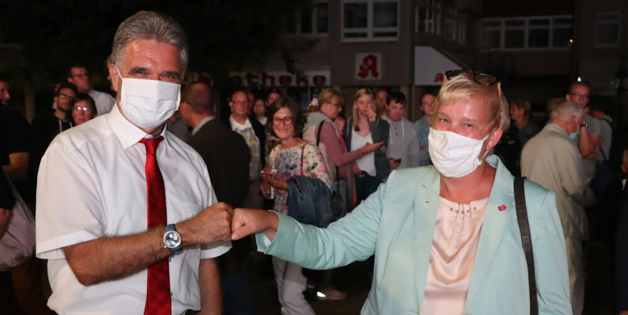 Monika Engels-Welter (CDU) gratuliert Bürgermeister Erwin Esser (SPD) zu seinem Sieg. Fünf weitere Jahre darf Esser die Wesselinger Verwaltung führen.
