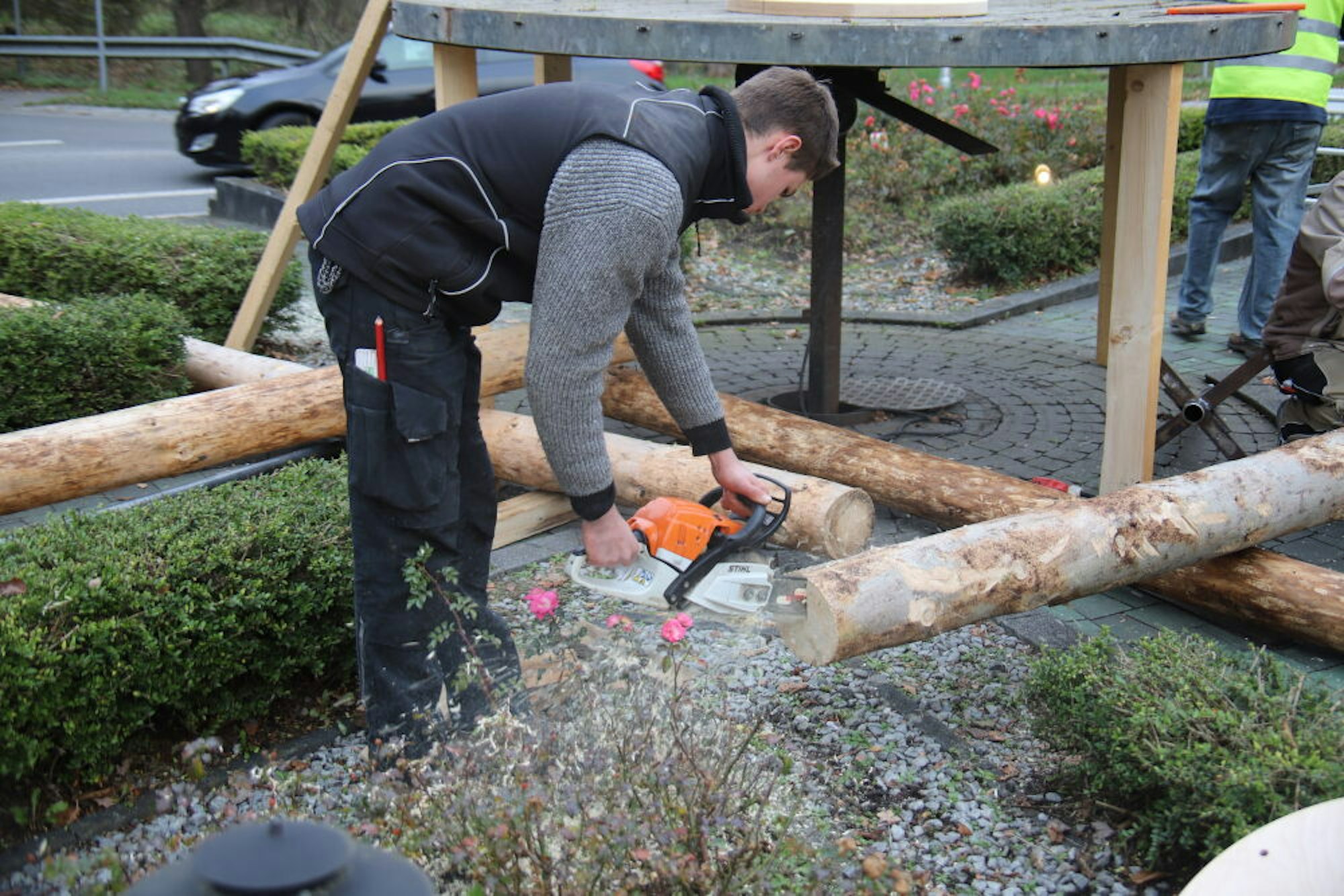 Die vier Baumstämme mussten vor Ort auf Maß gesägt werden, sie tragen unter anderem die vier Kerzen und die Flügel.