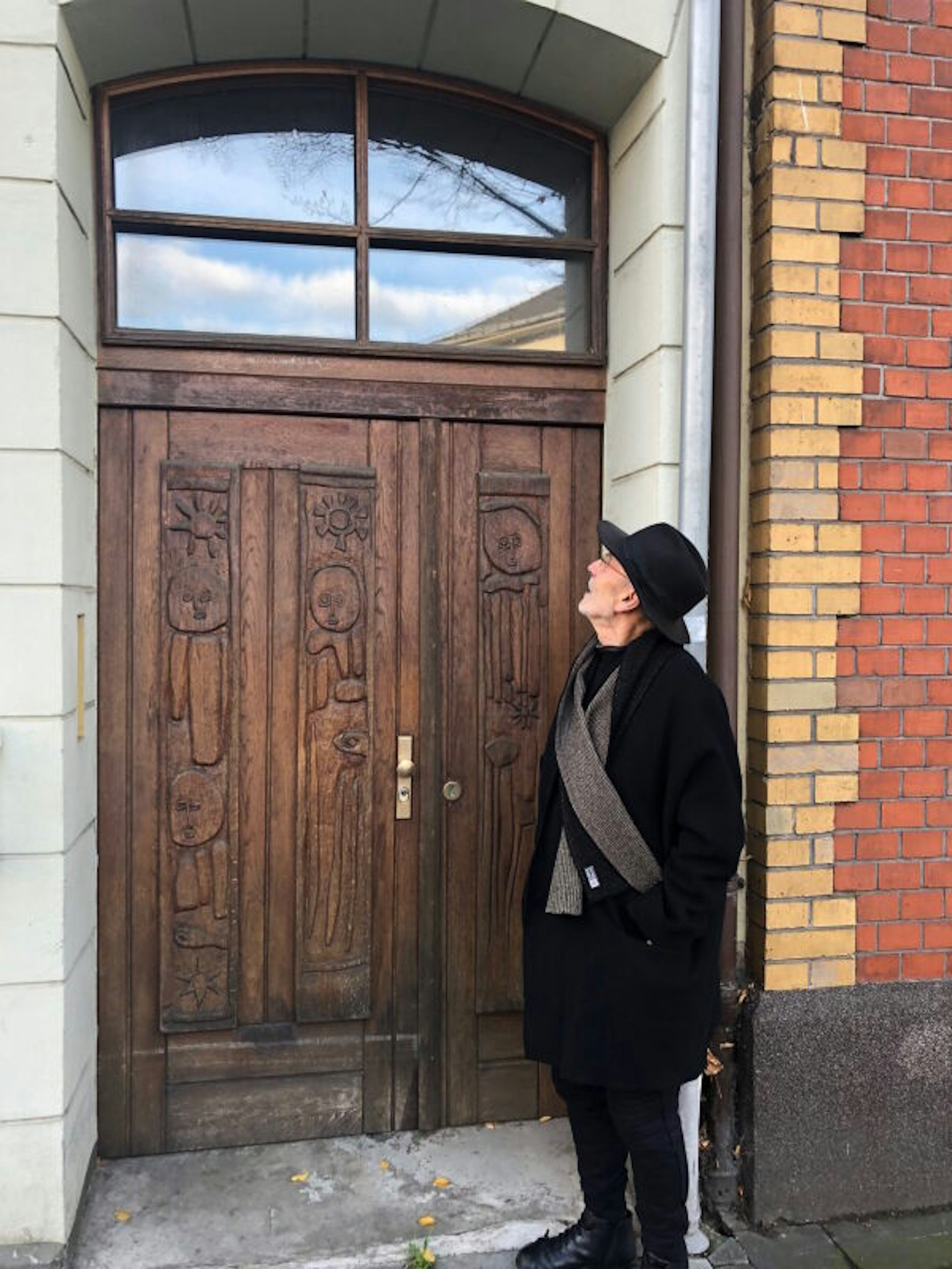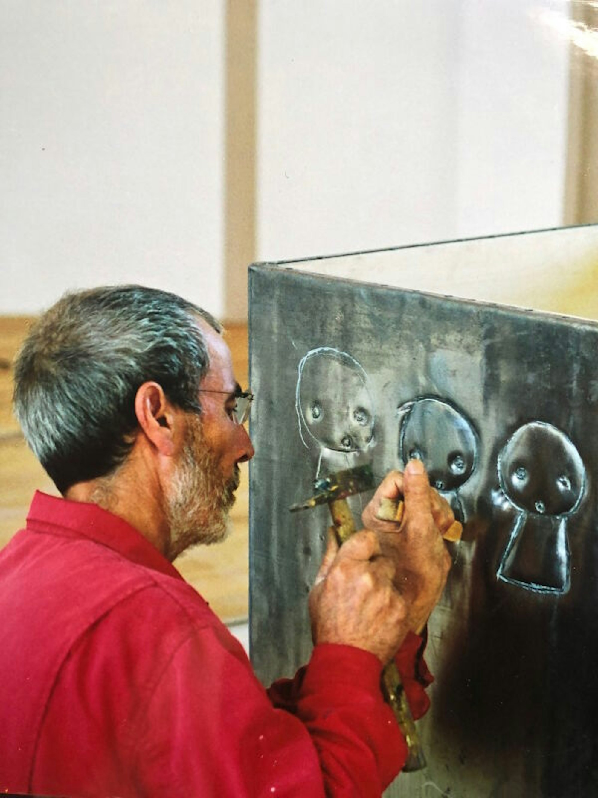 Die Haustür im ersten eigenen Haus, das die Familie 1974 am Troisdorfer Talweg kaufte, baute er selbst aus zehn Zentimeter dicker Eiche, schnitzte die für ihn so typischen Figuren mit ihren runden Köpfen, Knopfaugen und Klecksmündern. Nach Feierabend malte er, im Keller, in seinem zwei mal vier Meter großen „Atelier“. Farben und Materialien durfte er bald aus der Firma mitnehmen: Sein Chef hatte 1975 eine Ausstellung besucht und drei Bilder auf Kupferplatte gekauft.