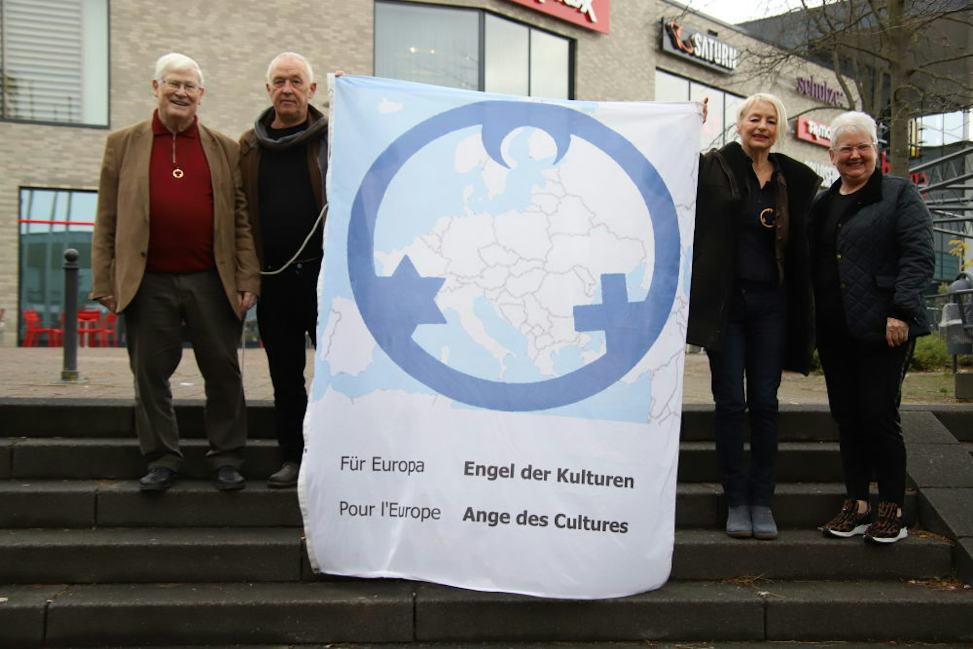 Rechts: Gregor Schröder, Gregor Merten, Carmen Dietrich und Helene Hammelrath (v.l.) mit dem Banner der „Engel der Kulturen“.