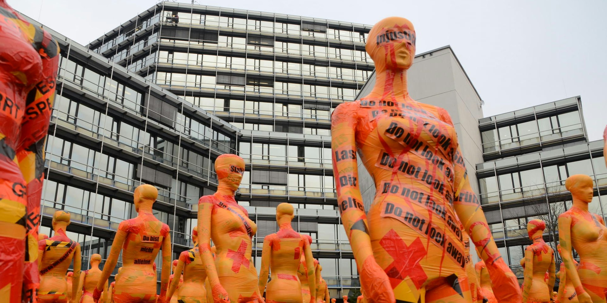 Siegburg – Sie halten eine stille Mahnwache, der Appell ist umso deutlicher: 222 weibliche Schaufensterpuppen hat der Künstler Dennis Meseg vor dem Kreishaus in Siegburg aufgestellt, als Zeichen des Protests gegen die nach wie vor alltägliche Gewalt gegen Frauen in aller Welt.
