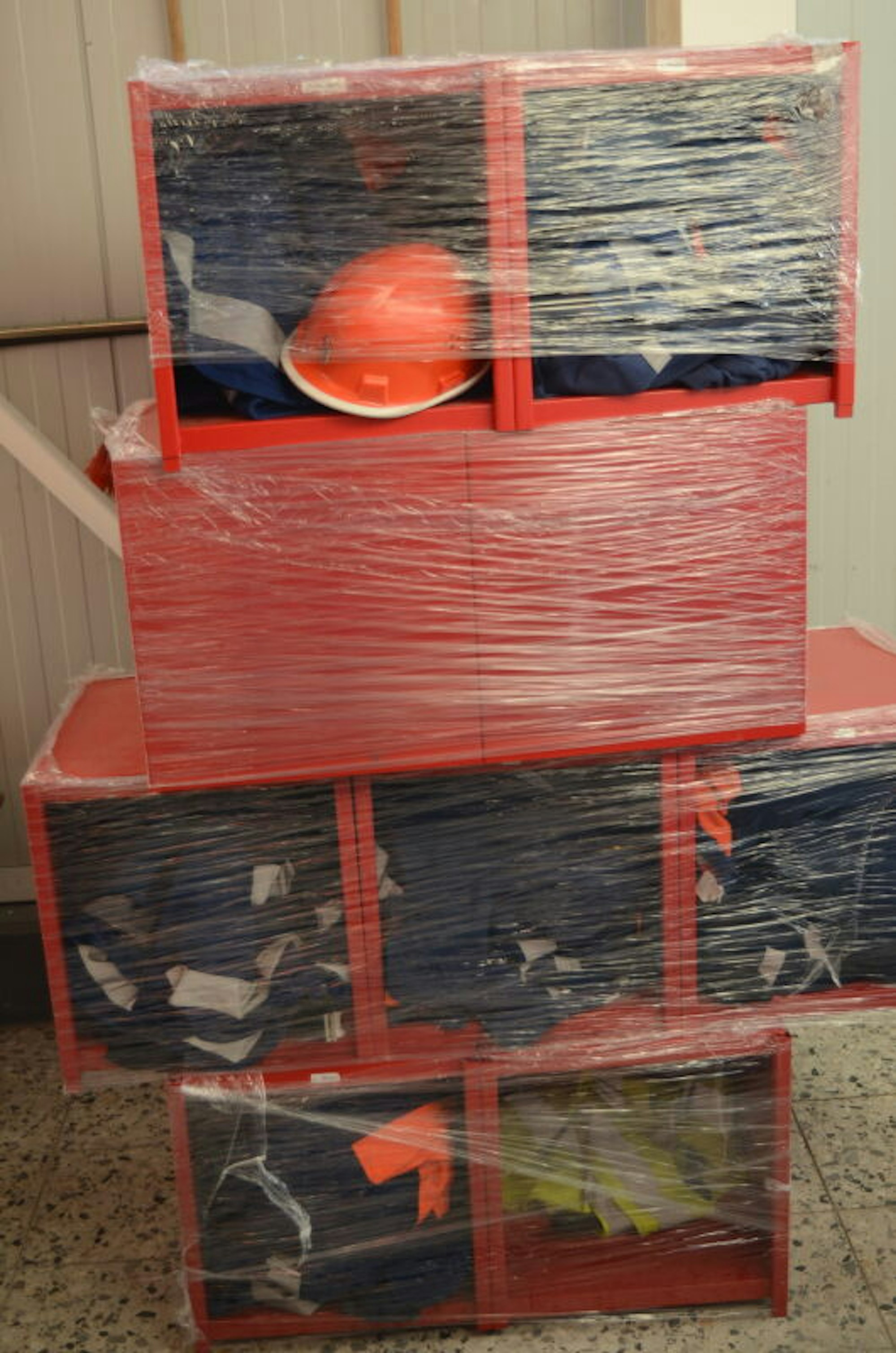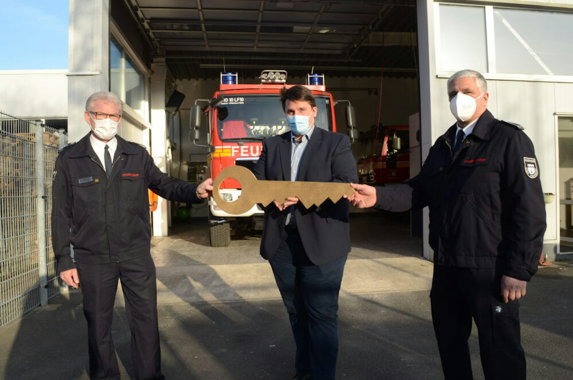 Noch verpackt sind die Monturen der Jugendfeuerwehr, dem Umzug vor drei Wochen folgte nun die Schlüsselübergabe (von links): Stefan Gandelau, Alexander Biber und Salvatore Rizzello.