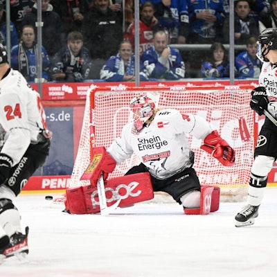 Carter Proft (l.) von den Kölner Haien vor dem Bremerhavener Goalie Maximilian Franzreb.