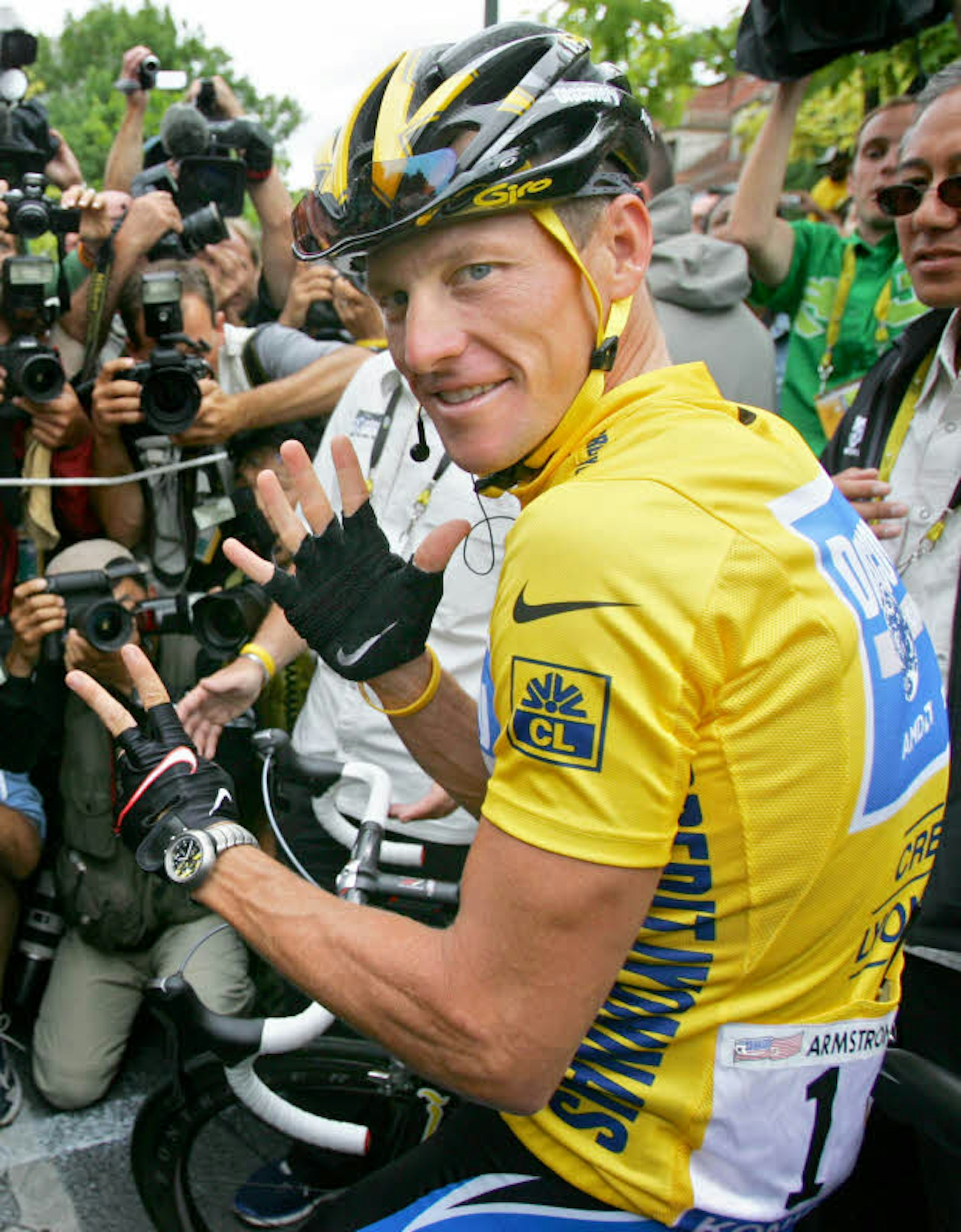 Juli 2005: Lance Armstrong zeigt es mit seinen Fingern an. Sieben Tour-Siege hat er nun gesammelt. Glaubt er.