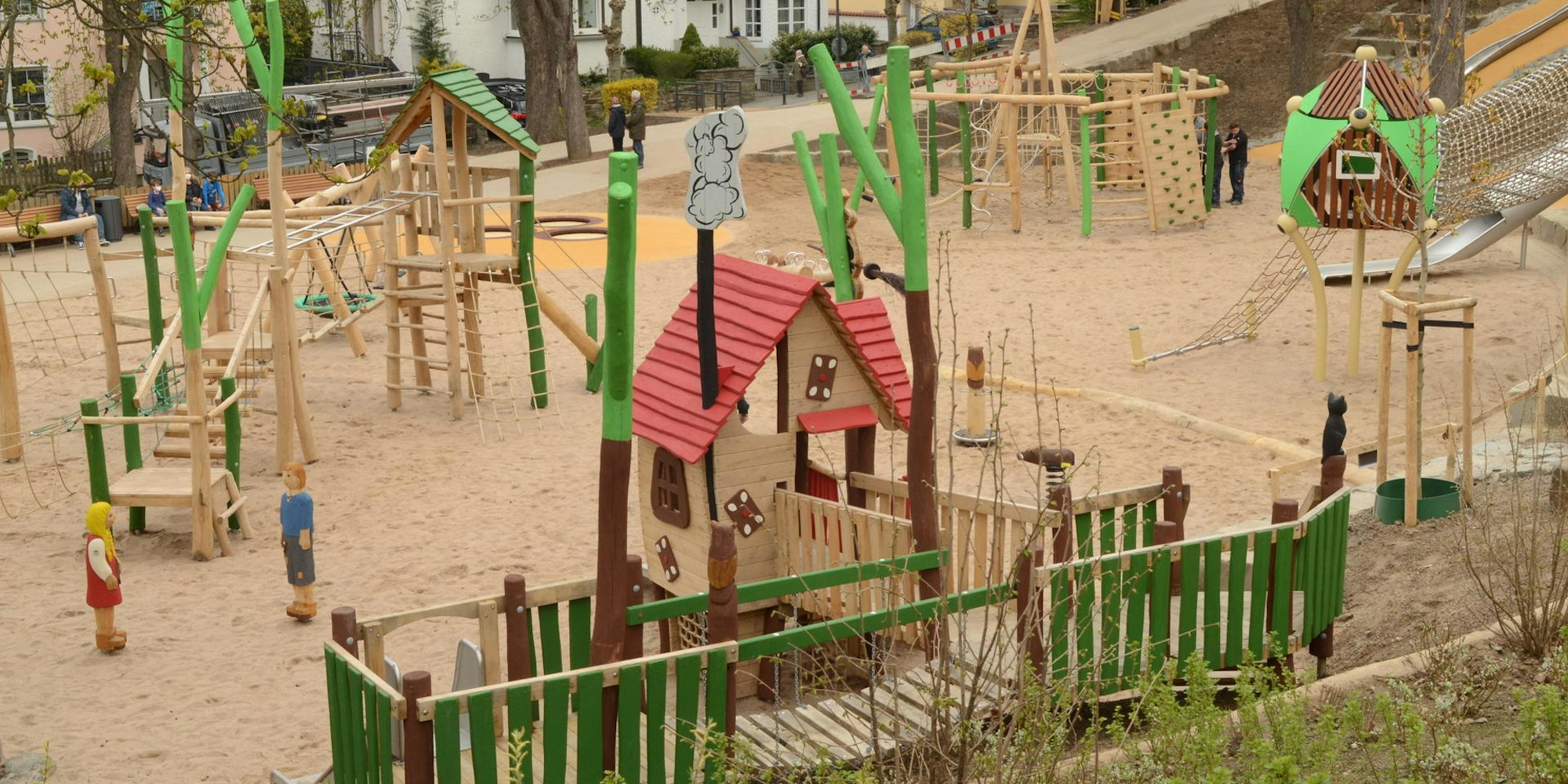 Ein Hexenhäuschen und die Figuren von Hänsel und Gretel auf dem neuen Spielplatz in Siegburg