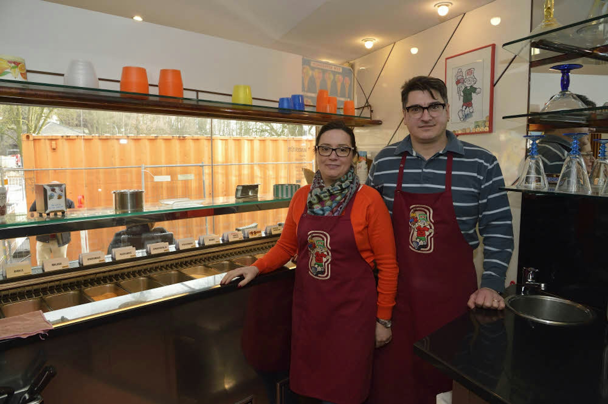 Die Besitzer des Eiscafés, Sonia und Simone Stefani, gegenüber dem Forumpark fürchten um ihre Existenz.