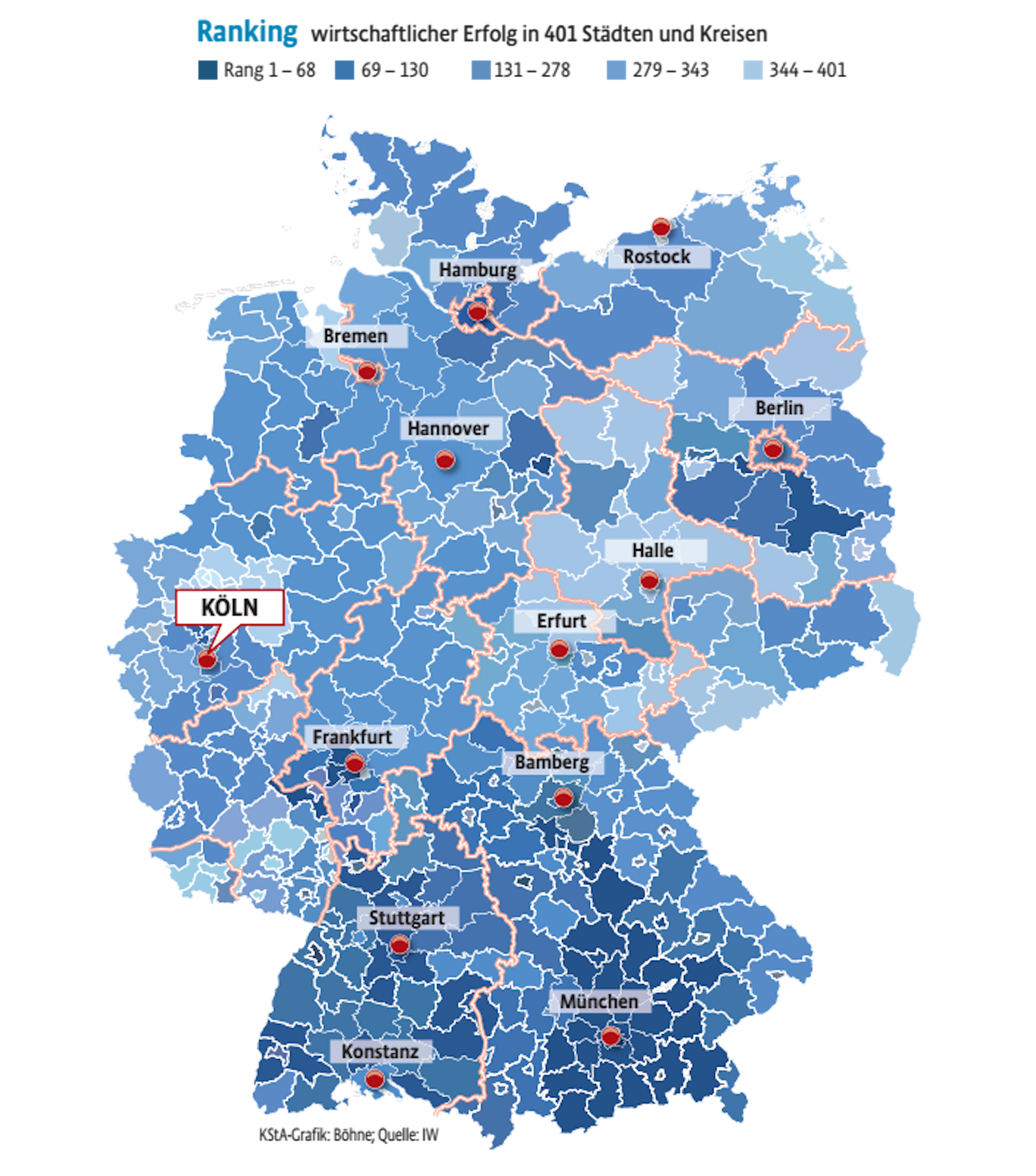 Weniger erfreulich schneidet Köln bei der klassischen Standort- Analyse ab. Dabei wurden Faktoren untersucht, die den derzeitigen Erfolg einer Region ausmachen. Bei der Wirtschaftsstruktur belegt Köln nur Platz 30 von 401. Beim letzten Regional-Ranking 2016 landete Köln allerdings noch weiter hinten, auf Rang 42. Die Platzierung erklärt sich unter anderem dadurch, dass Köln im Vergleich weniger Grund-, Gewerbe-, Einkommens- und Umsatzsteuer einnimmt.